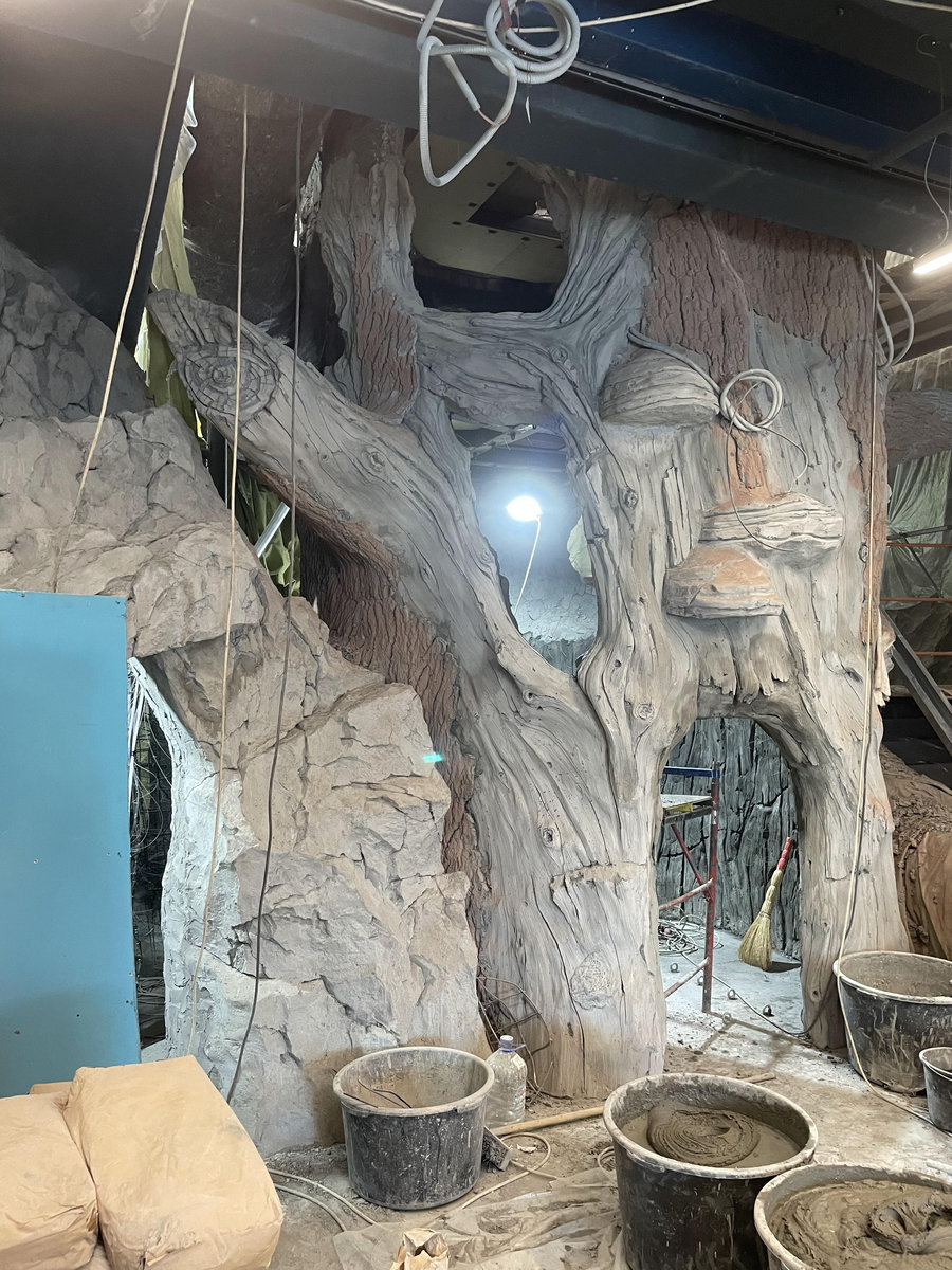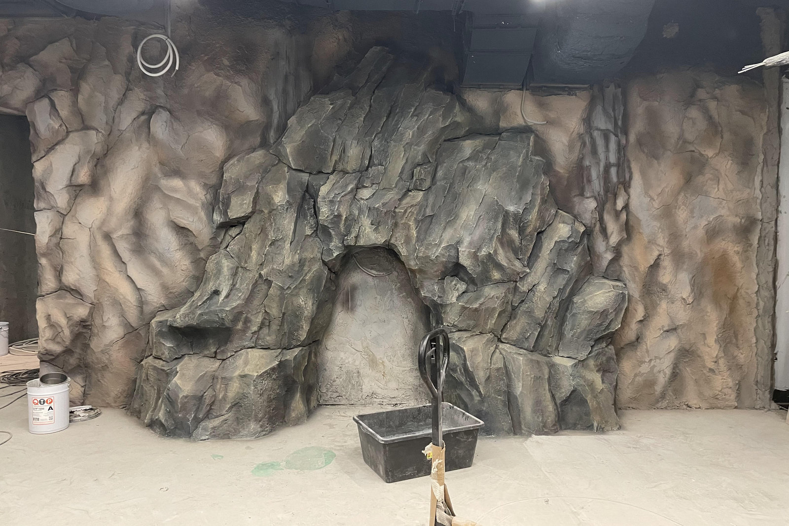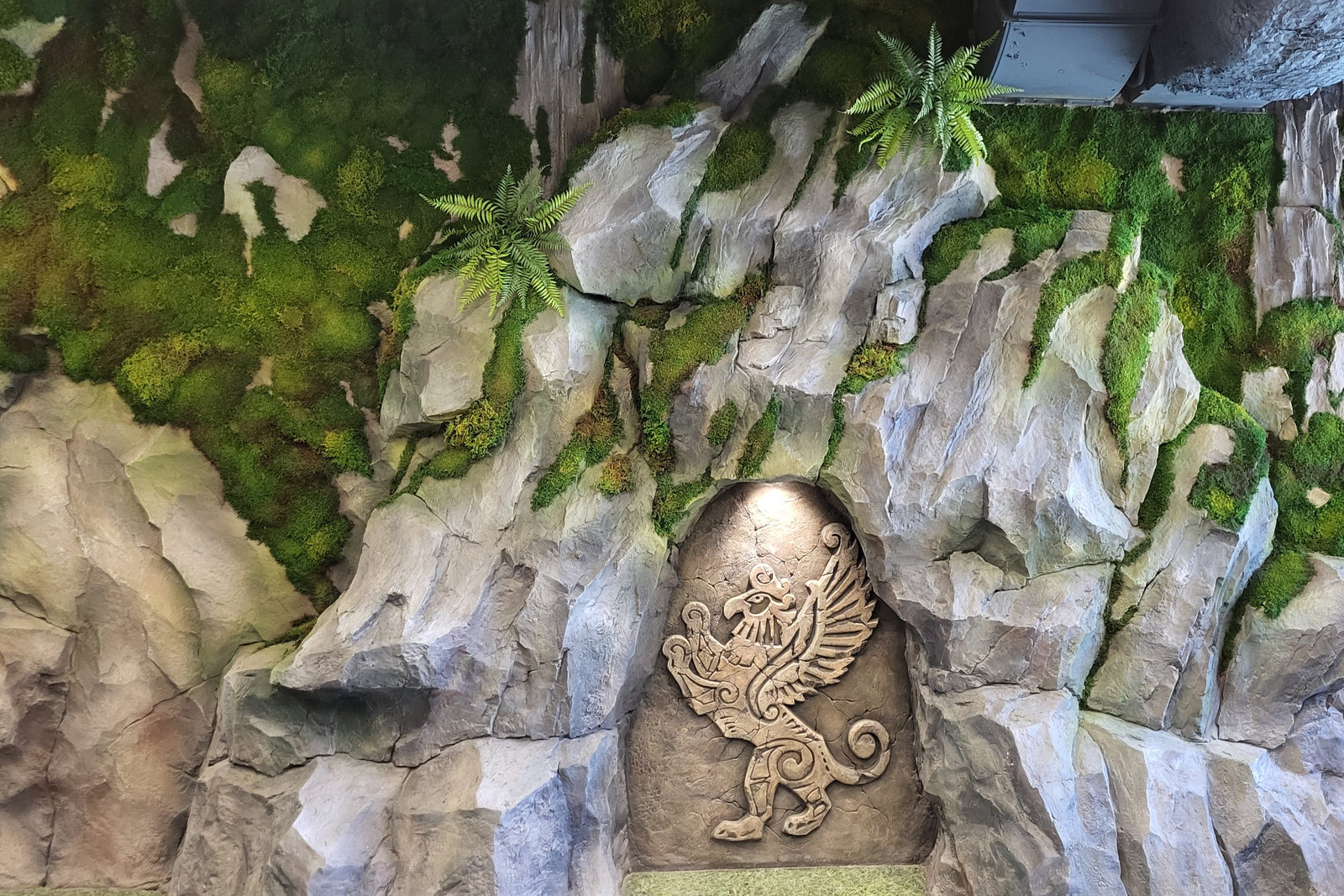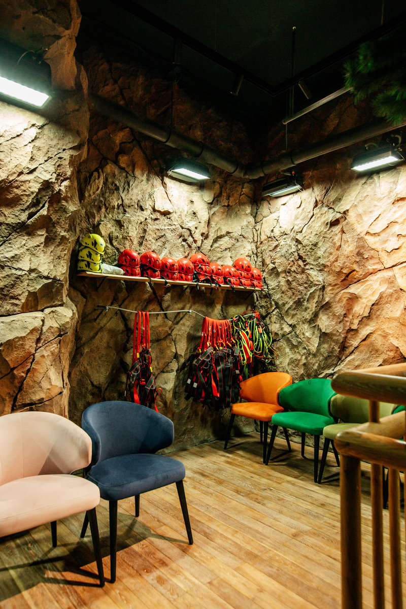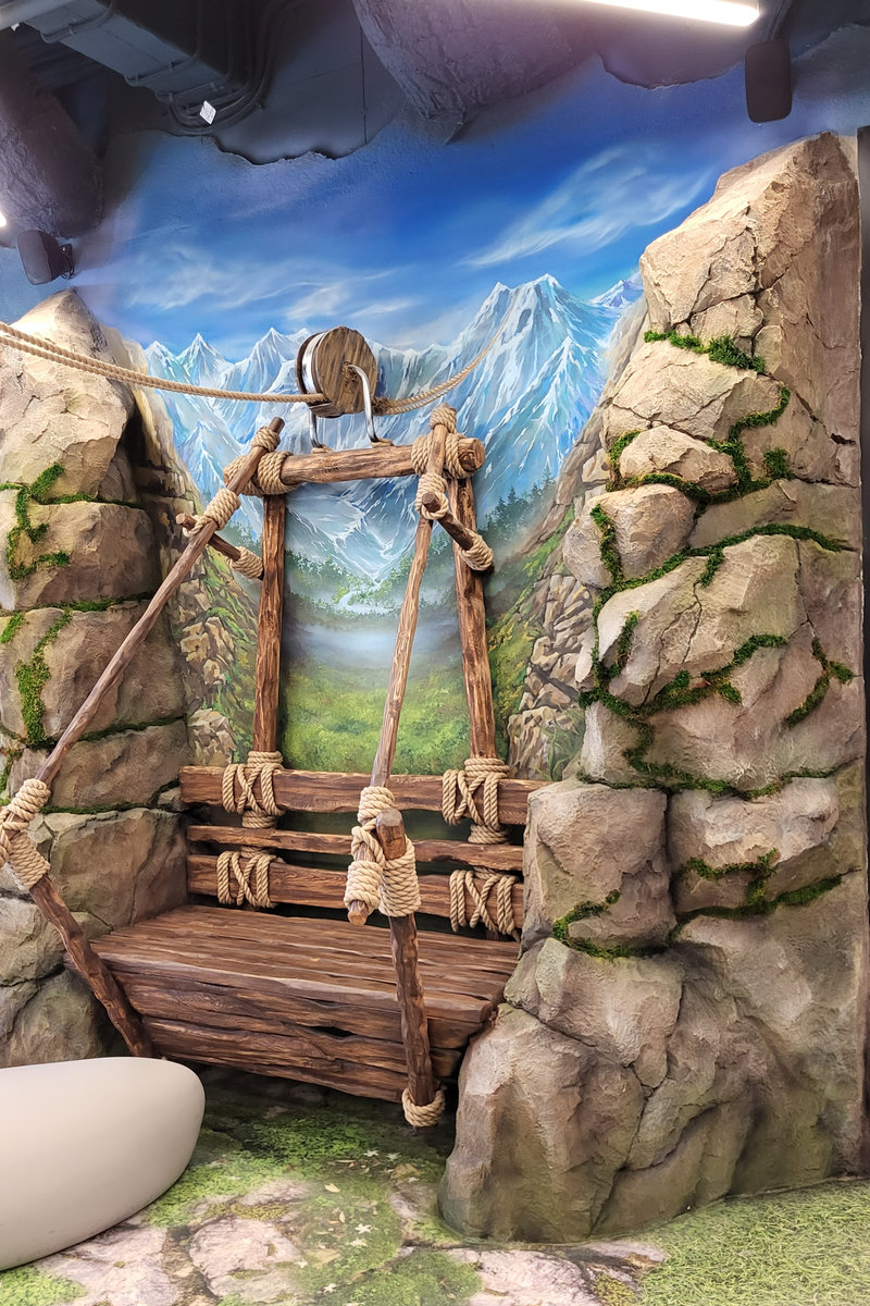 Когда смотришь на стену, превращенную в каменный уступ, трудно поверить, что она сделана из бетона. В этом и заключается сила материала: он не просто повторяет природные формы, а органично вписывается в интерьер. Скала выглядит естественно, будто ее заложили при строительстве, а не создали позже.