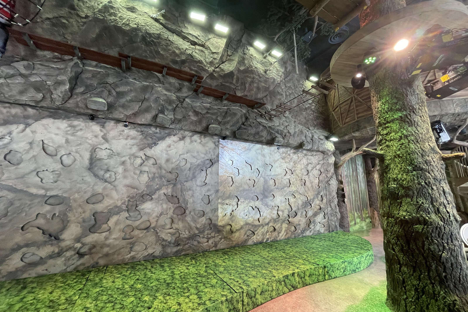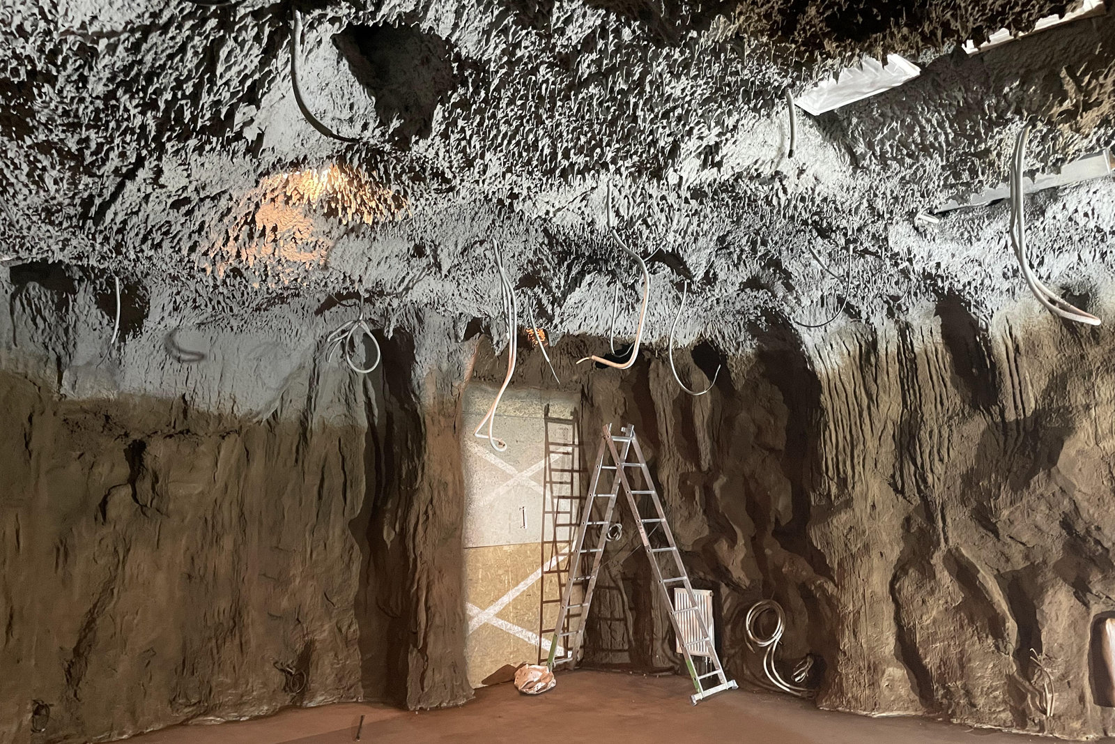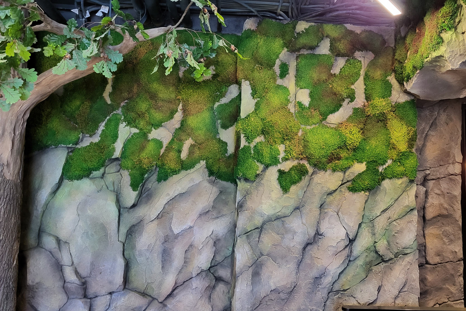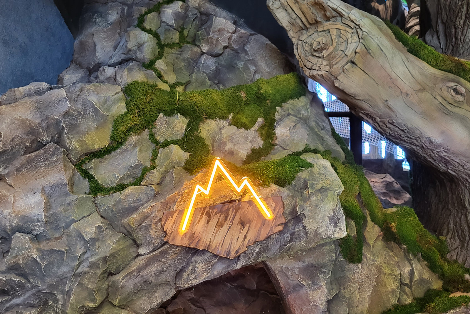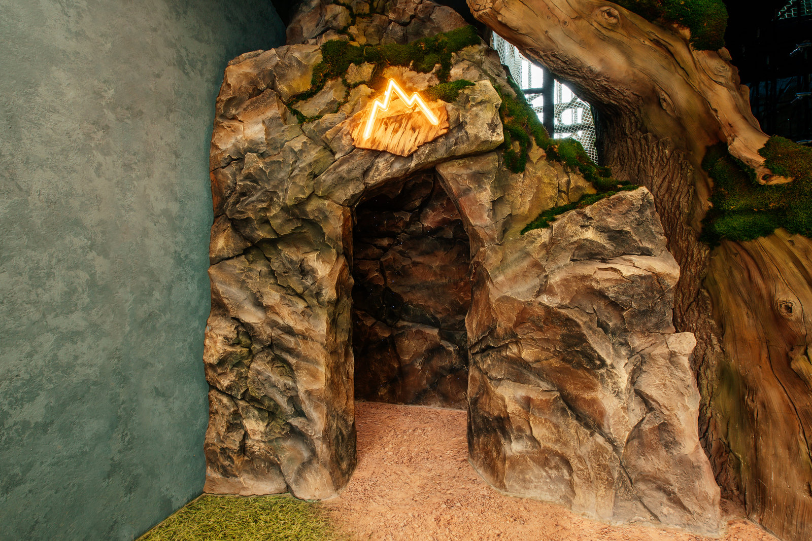 Когда смотришь на стену, превращенную в каменный уступ, трудно поверить, что она сделана из бетона. В этом и заключается сила материала: он не просто повторяет природные формы, а органично вписывается в интерьер. Скала выглядит естественно, будто ее заложили при строительстве, а не создали позже.