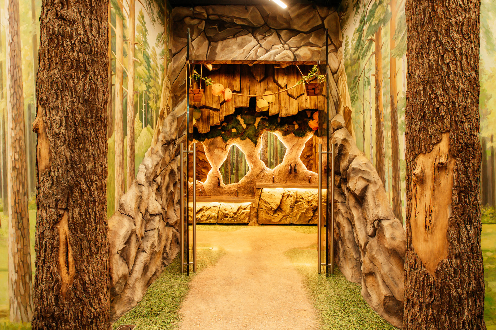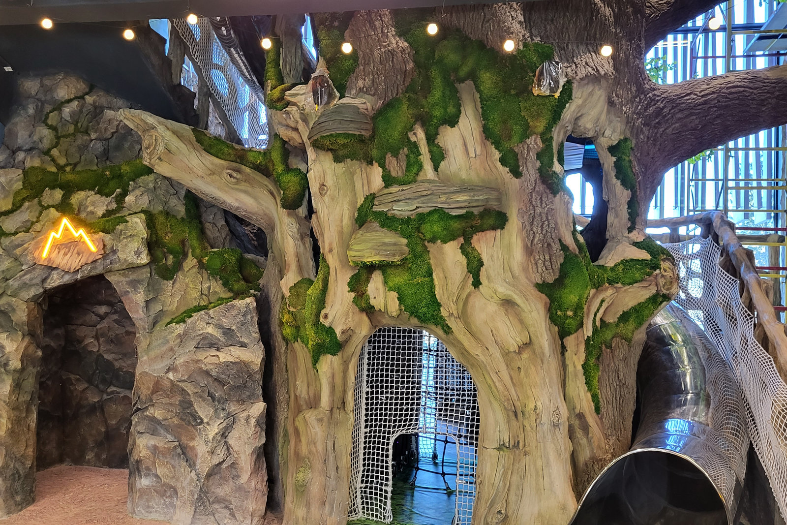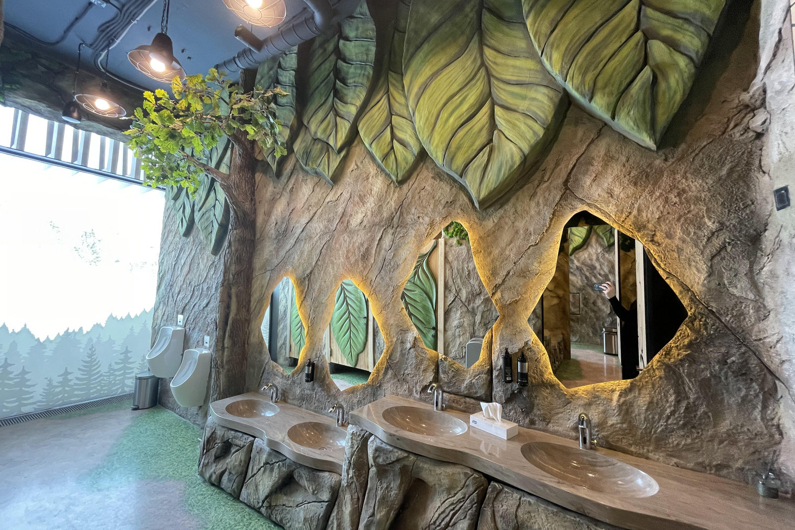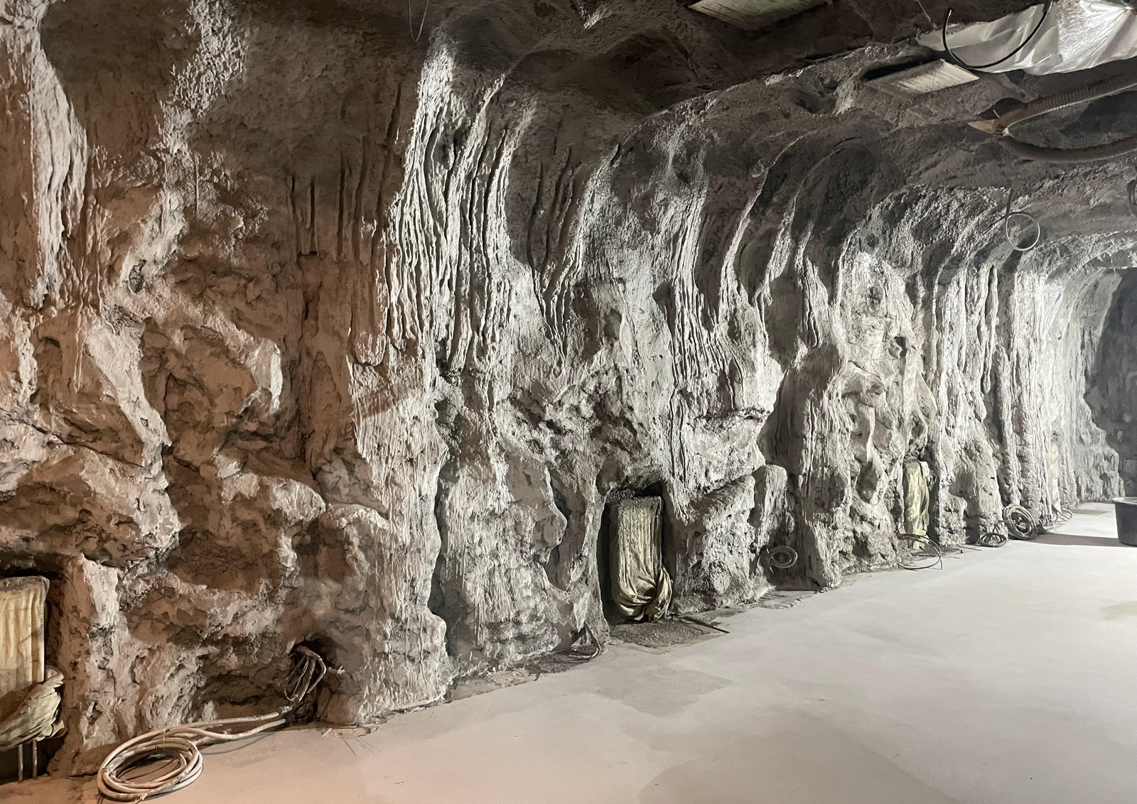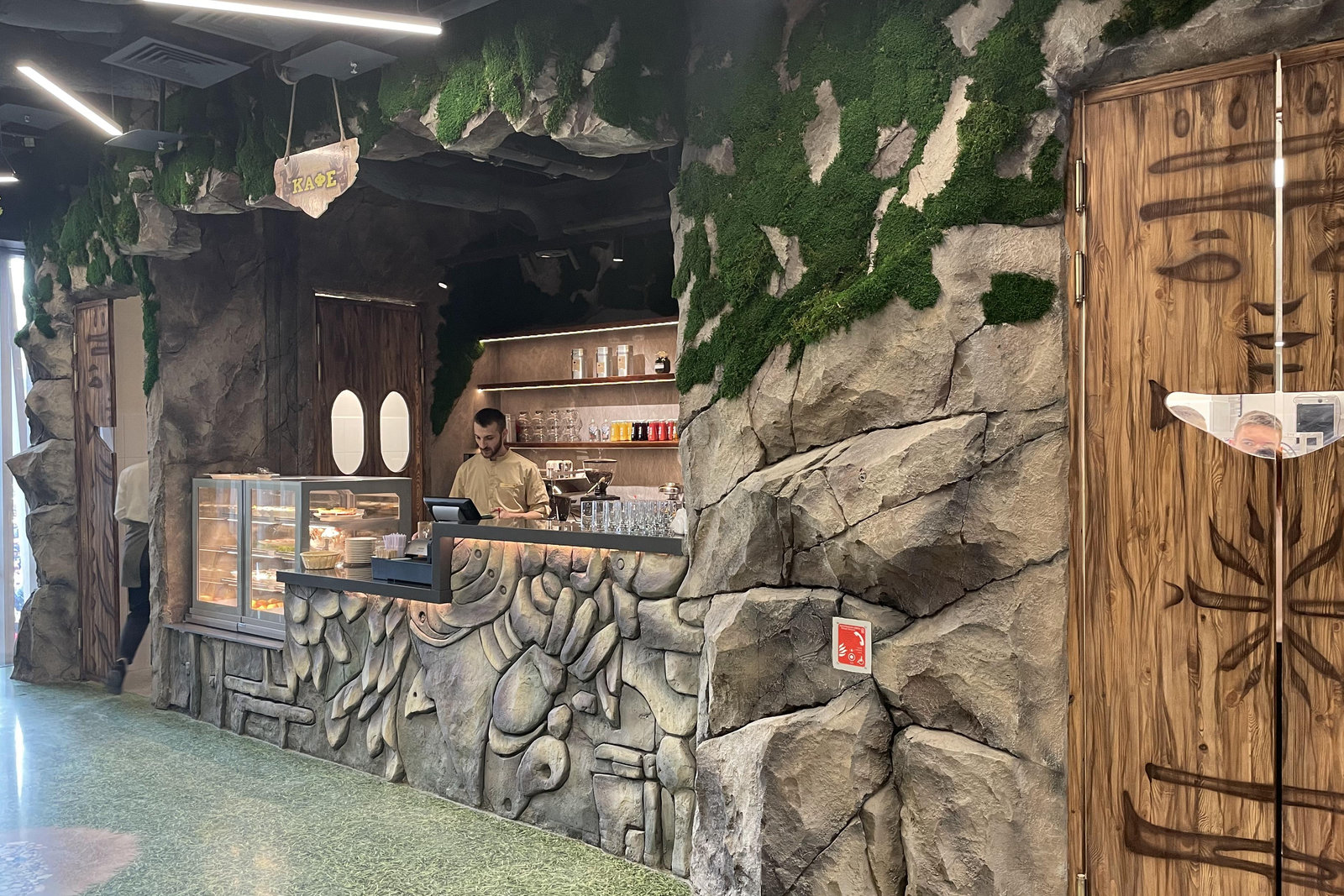 Когда смотришь на стену, превращенную в каменный уступ, трудно поверить, что она сделана из бетона. В этом и заключается сила материала: он не просто повторяет природные формы, а органично вписывается в интерьер. Скала выглядит естественно, будто ее заложили при строительстве, а не создали позже.