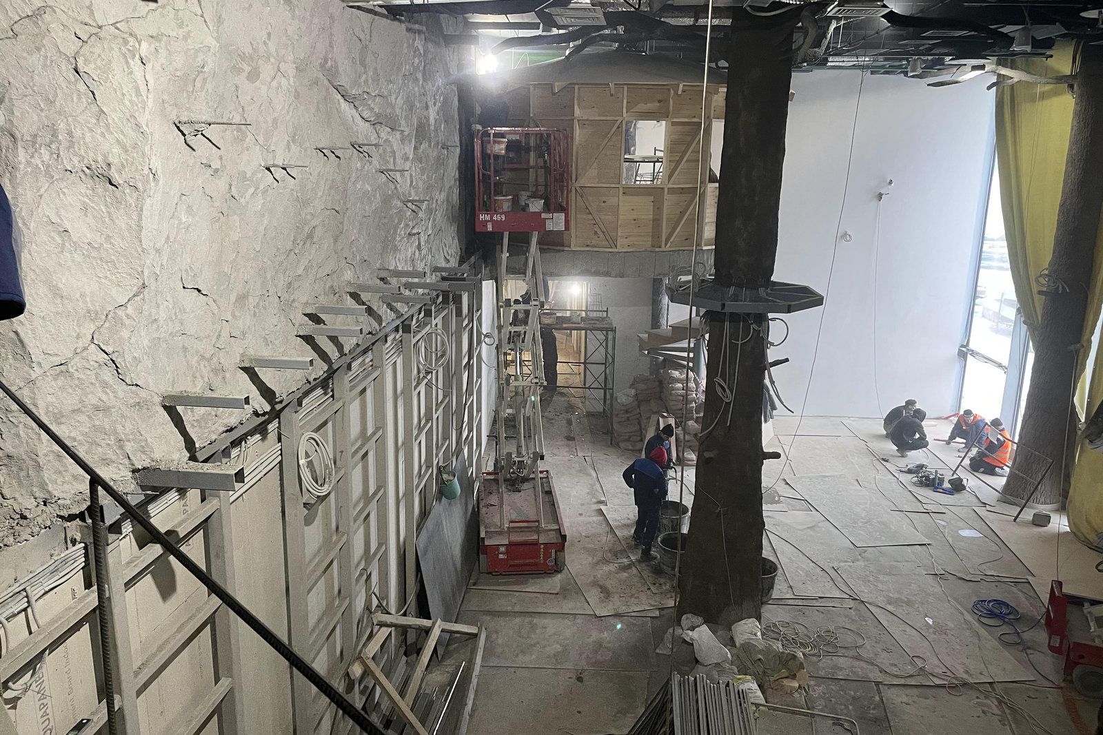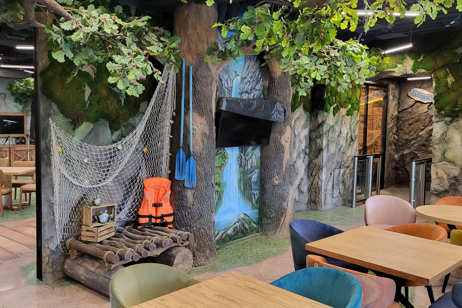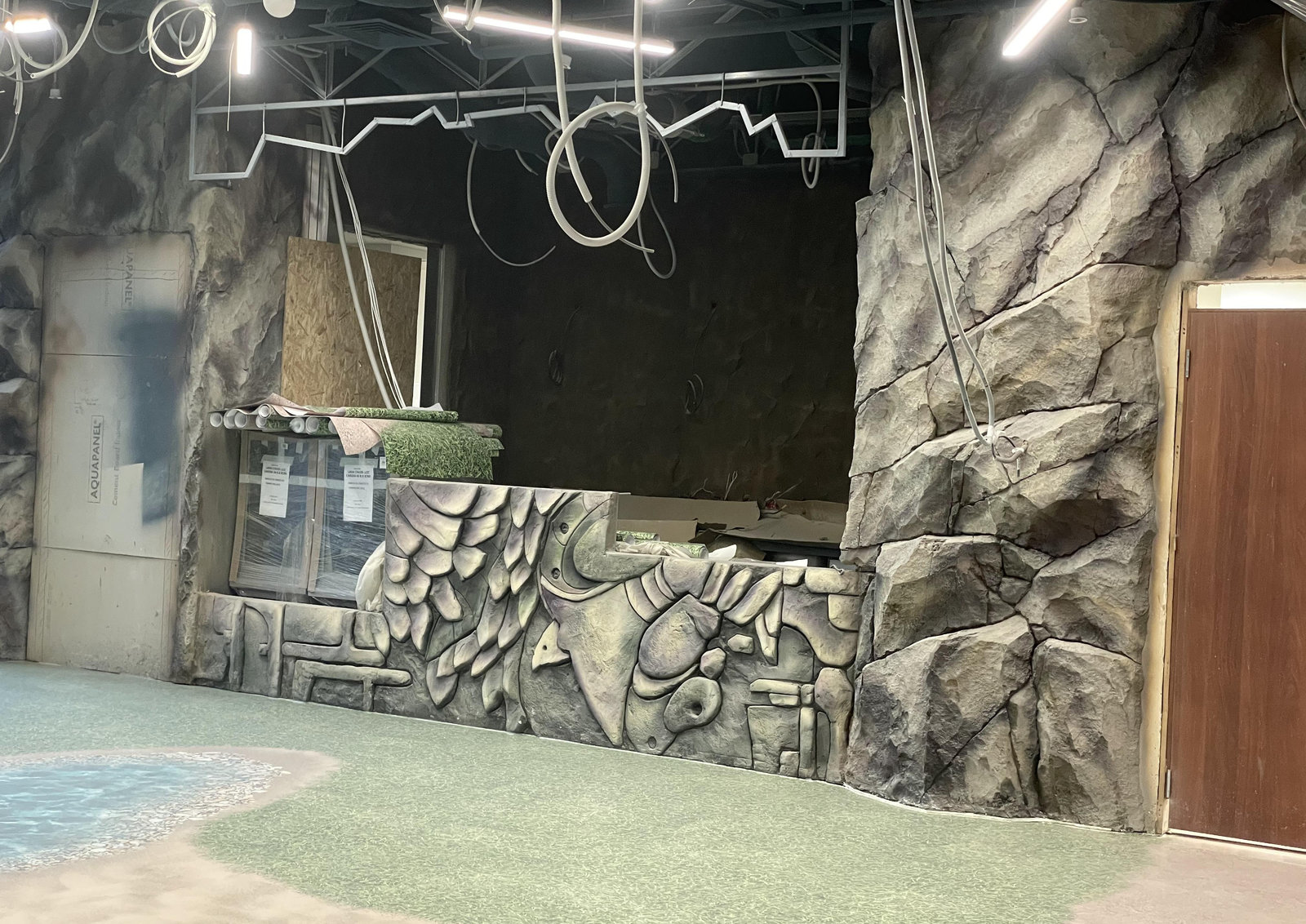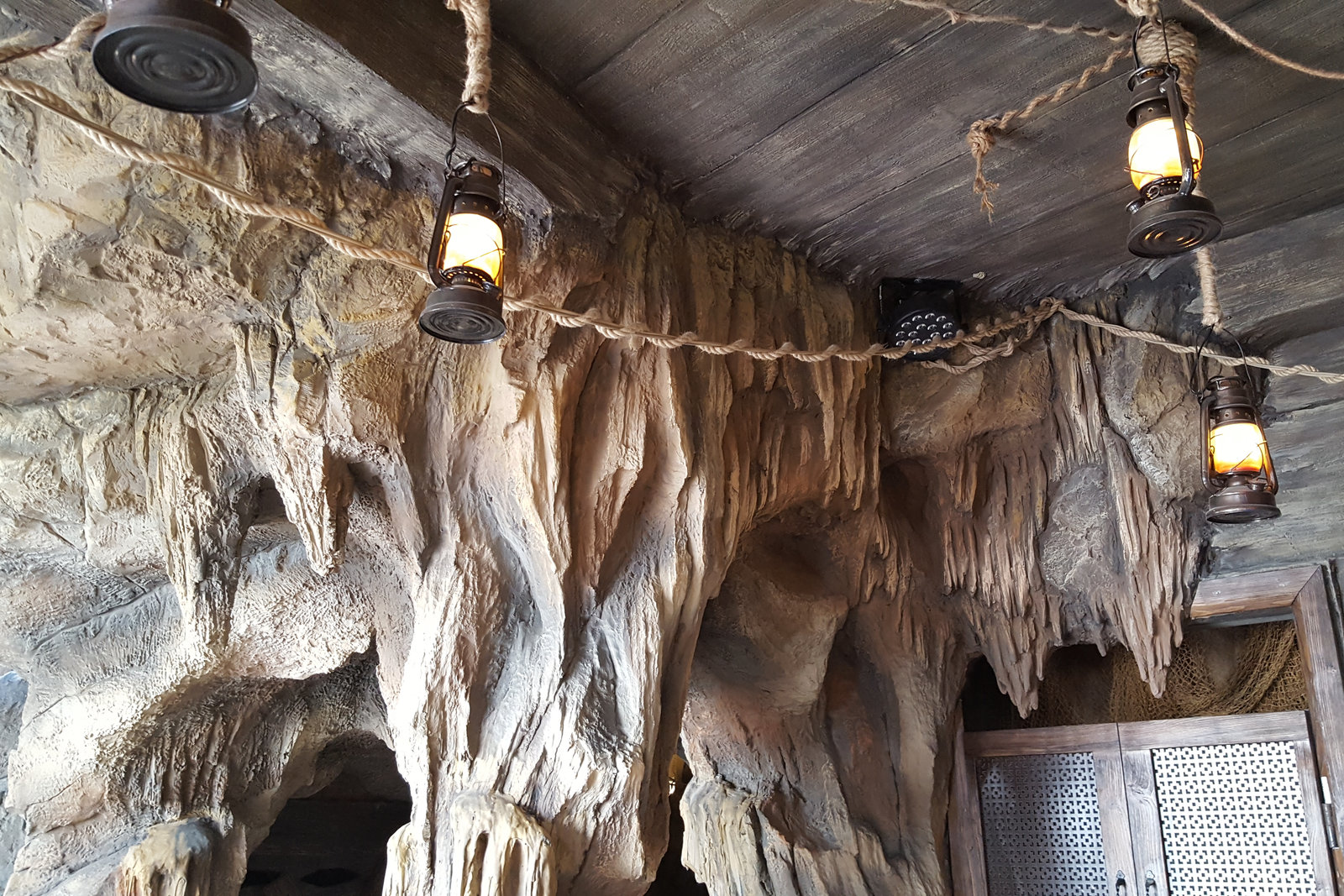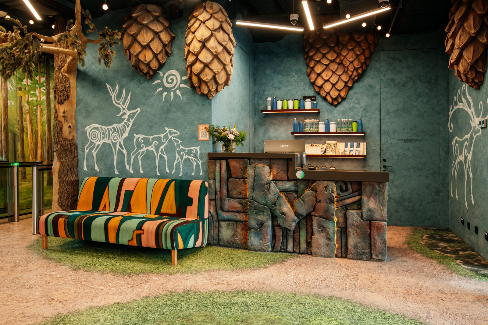 Когда смотришь на стену, превращенную в каменный уступ, трудно поверить, что она сделана из бетона. В этом и заключается сила материала: он не просто повторяет природные формы, а органично вписывается в интерьер. Скала выглядит естественно, будто ее заложили при строительстве, а не создали позже.