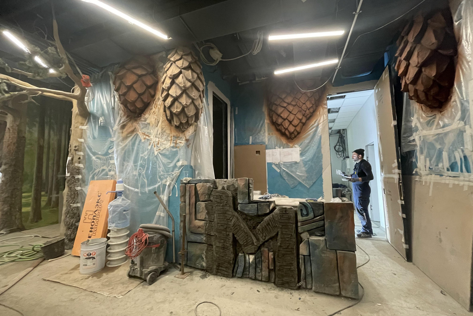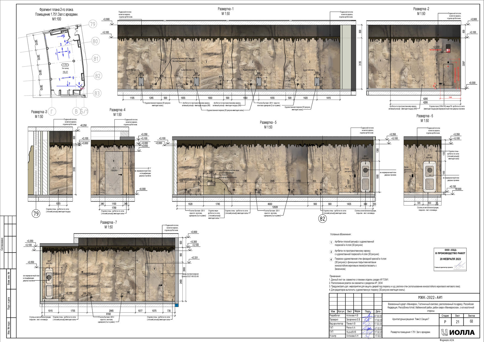 Имитация скальных пород в интерьере начинается с идеи и эскиза. На этом этапе разрабатывают форму будущей композиции, масштаб, глубину, выносы и то, где будут проходить коммуникации — подсветка, розетки или провода для телевизора. Только после этого приступают к строительной части.