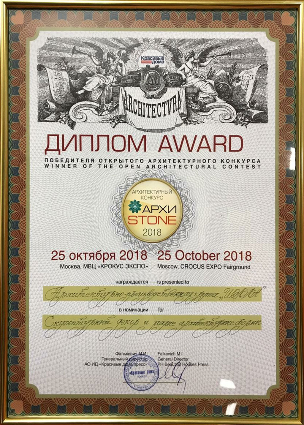 Уже второй год, Издательский дом «Красивые дома» при официальной поддержке Союза архитекторов России, Союза московских архитекторов (СМА) проводит Открытый архитектурный конкурс «Архистоун-2018». Свои работы на суд жюри представляют архитекторы, скульпторы, дизайнеры, декораторы, художники, а также преподаватели и студенты соответствующих факультетов и представители смежных профессий. В этом году конкурс проводился в номинациях: «Камень в отделке фасадов», «Камень в ландшафтном дизайне», «Камень в интерьере», «Скульптурный декор и малые архитектурные формы».