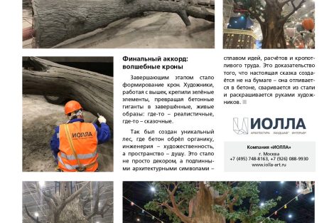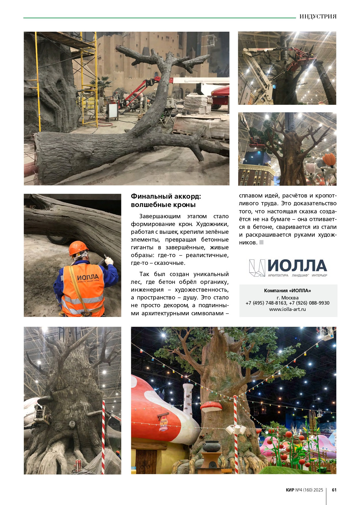 Строительно-художественная компания «Иолла» информирует о публикации в специализированном «Каталоге индустрии развлечений» («КИР») материала, посвященного завершенному проекту «Лес из артбетона». Эксперты издания отметили инновационное применение композитных материалов для создания ландшафтных объектов, не отличимых от природных аналогов.