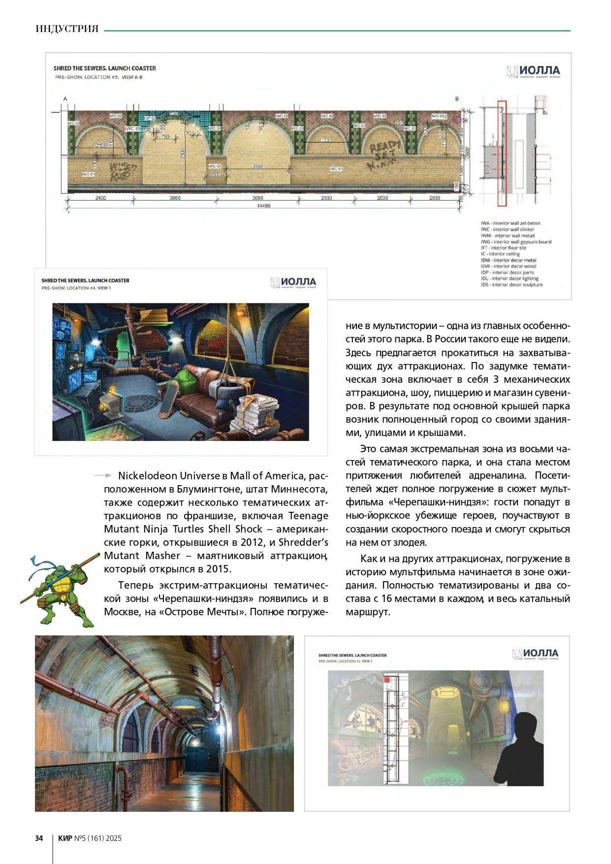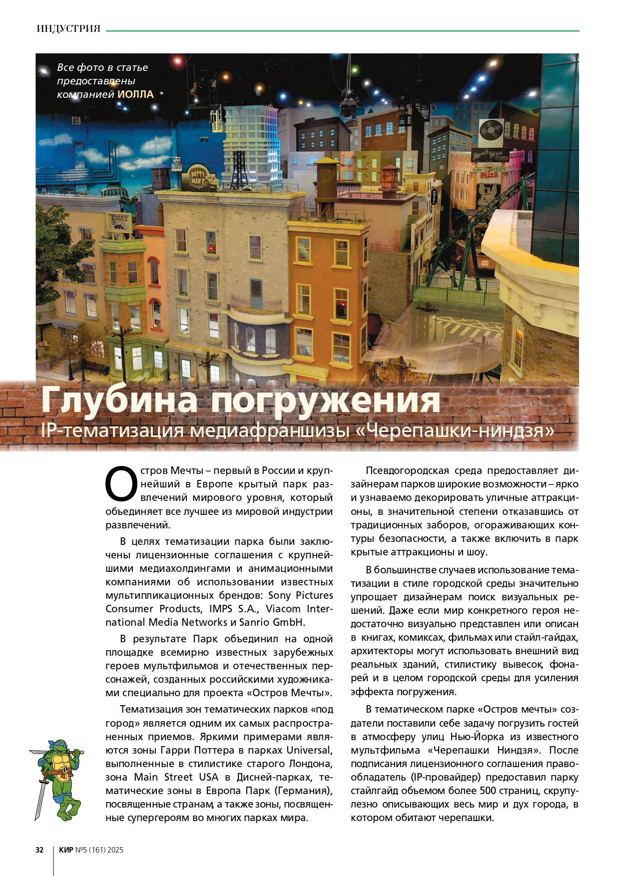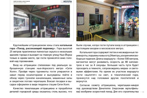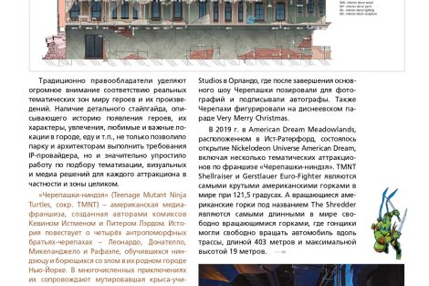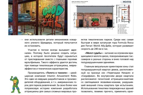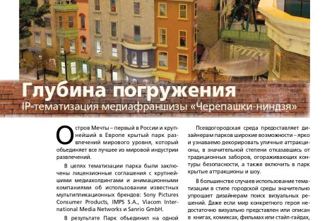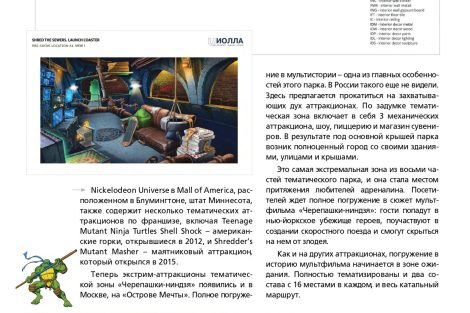 Команда разработчиков парка развлечений «Остров мечты» сообщает о публикации в авторитетном «Каталоге индустрии развлечений» («КИР») материала, посвященного концепции и технической реализации нового аттракциона «Черепашки-ниндзя». Журнал отметил комплексный подход к созданию динамичного семейного развлечения и высочайший уровень детализации.
