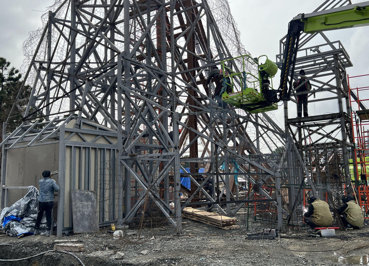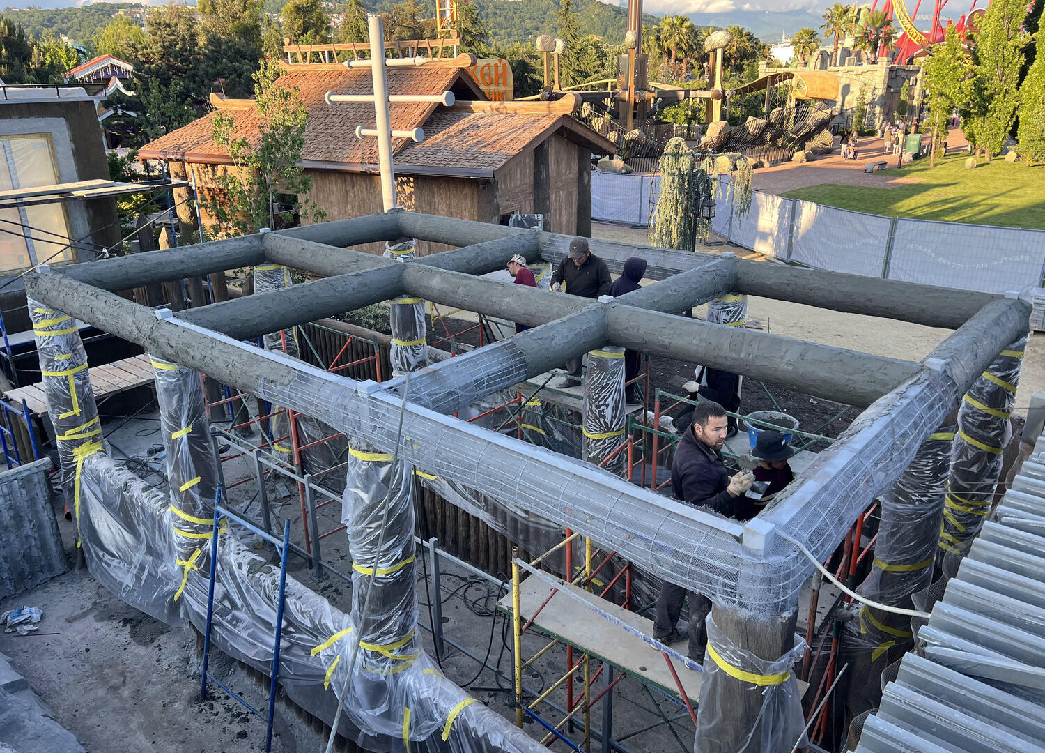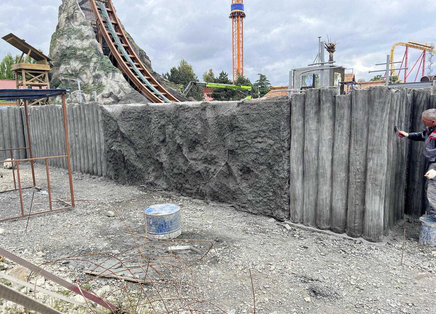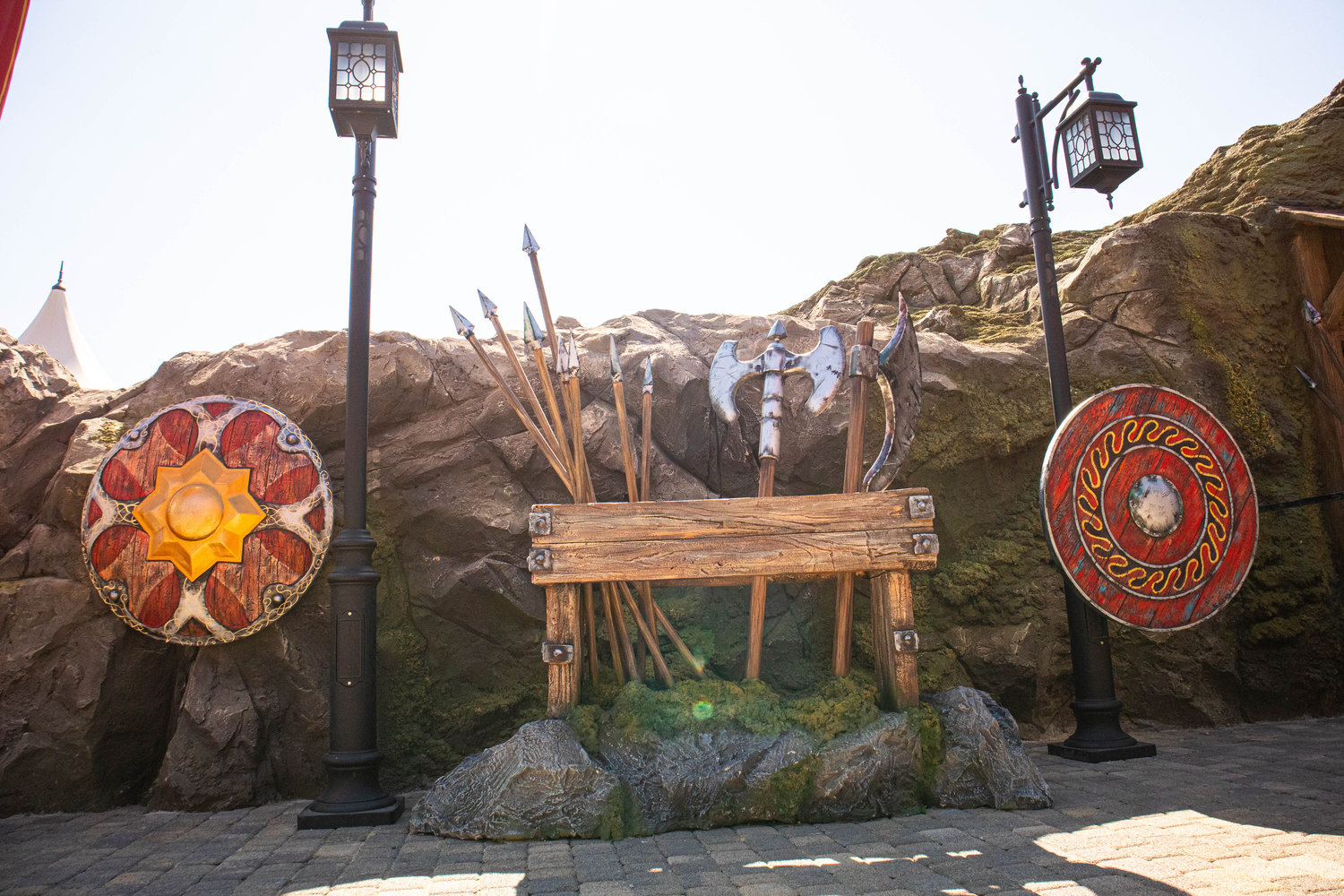 Сюжет обыгрывается через архитектурную среду. Зона оформления включает в себя массивные сторожевые башни, оборонительные постройки, катапульты, флаги, оружие и доспехи. Все элементы проработаны с максимальным вниманием к деталям и аутентичности. Башни и другие высокие конструкции реализованы по технологии арт-бетона: на основе металлических ферм и стоек создаётся каркас, обшиваемый арматурой. По этой структуре скульпторы формируют объём и прорисовывают фактуры — каменные блоки, деревянные балки, слои мха, кованые элементы. Всё окрашивается вручную, добиваясь полной реалистичности и выразительности.