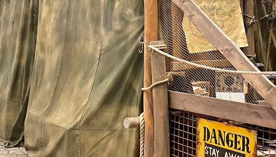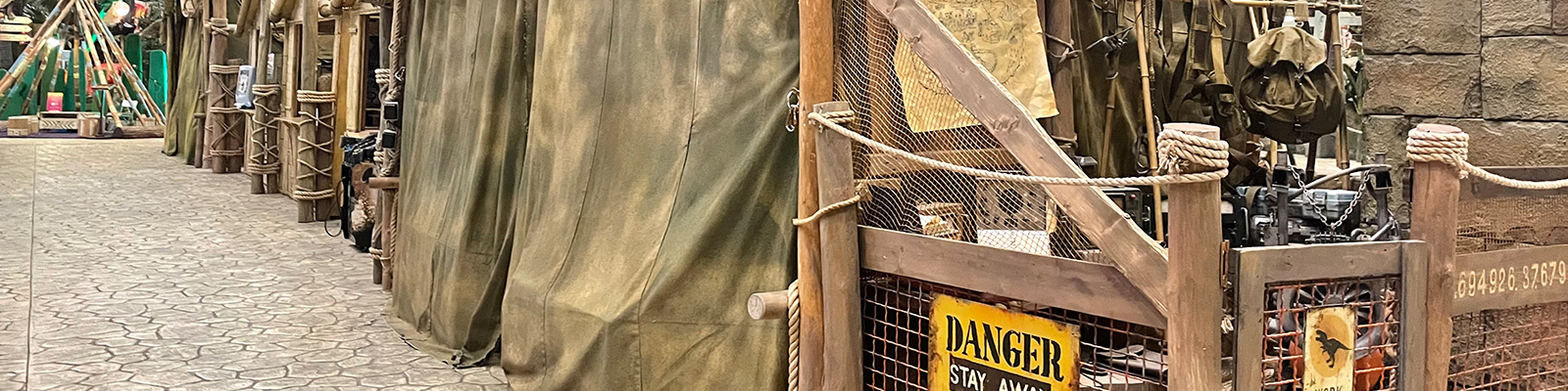 Для решения задачи по монтажу части «съеденной» крыши палатки пришлось использовать подъемную технику, так как гигантский динозавр, чья голова нависает над все базой, выполнен в масштабе 1:1. Итоговый вариант выглядит максимально правдоподобно и максимально забавно. Для достижения этой задачи было затрачено немало времени и усилий, хотя именно эта часть работы была самой увлекательной.