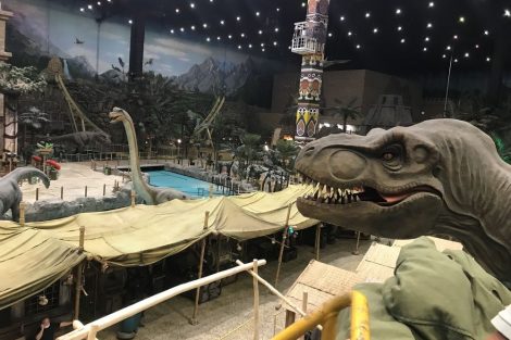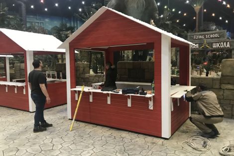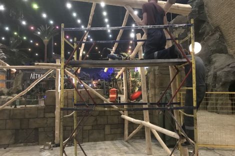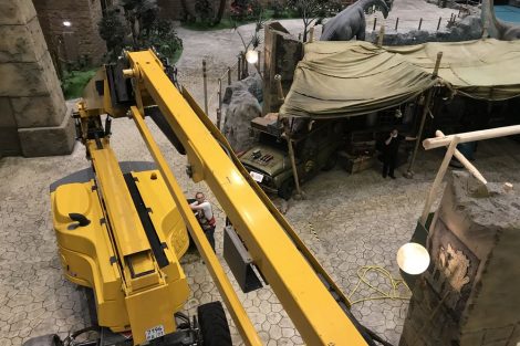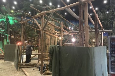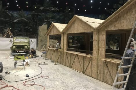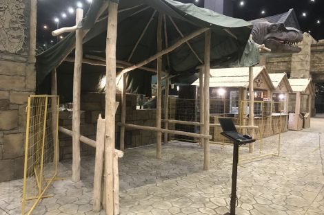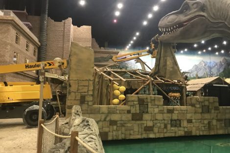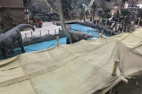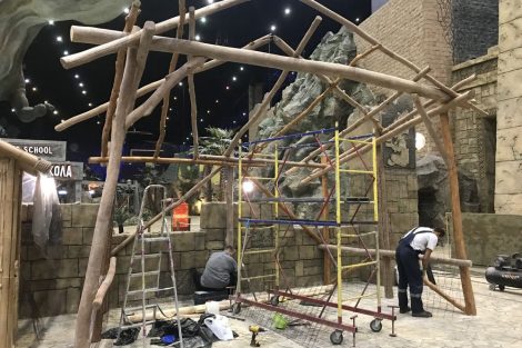 Для решения задачи по монтажу части «съеденной» крыши палатки пришлось использовать подъемную технику, так как гигантский динозавр, чья голова нависает над все базой, выполнен в масштабе 1:1. Итоговый вариант выглядит максимально правдоподобно и максимально забавно. Для достижения этой задачи было затрачено немало времени и усилий, хотя именно эта часть работы была самой увлекательной.