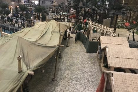 Около одной из палаток была сооружена постройка с радиооборудованием, приборами и картами. Сколочены столы и полки, на которых располагались походные рюкзаки, карты, документы, журналы. Одновременно в этой истории был задействован гигантский аниматроник динозавра, стоящий в озере в непосредственной близости от одной из палаток. Для создания максимального эффекта реалистичности в пасть динозавру прикрепили куски брезента и сетки с крыши палатки, выполнив композицию таким образом, чтобы мотающий из стороны в сторону головой динозавр, смотрелся так, будто он решил поиграть с археологами и зубами схватил палатку за верх крыши.