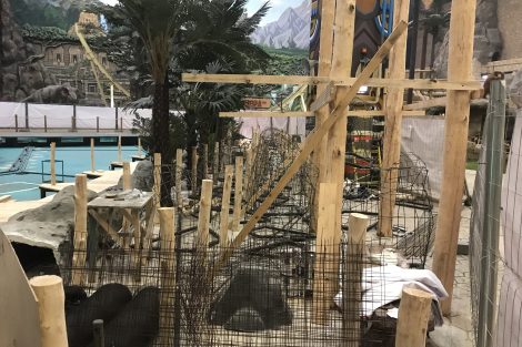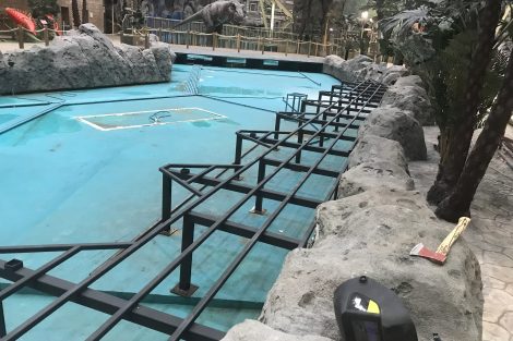 Конструкции изгороди имеют длинные пролеты, из-за того, что очередь располагается на прямом вытянутом участке и устойчивость конструкции должна быть максимально крепкой, так как во время ожидания посетители могут висеть и расшатывать их. Причал выполнен из металлических конструкций с гидрофобным покрытием, которые установлены таким способом, чтобы не нарушить гидроизоляционное покрытие чаши бассейна.