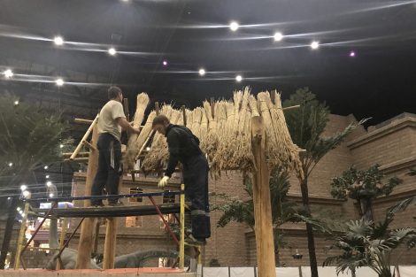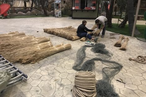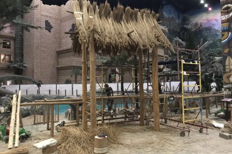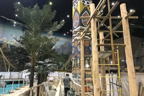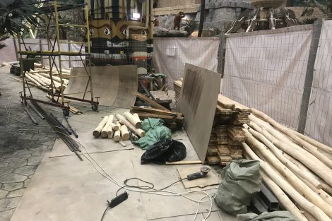 Стилистика пристани выбрана под окружающую среду, отсылая нас своим финальным дизайном к постройкам местных жителей в джунглях. Зона очереди выхода к лодкам представлена, как изгороди из кривых обрезанных стволов деревьев. Специально заготовленные жерди должны одновременно выглядеть, как дикие и одновременно быть максимально гладкими и обработанными, чтобы избежать не только травм, но и даже любого дискомфорта при тактильном контакте во время ожидания.