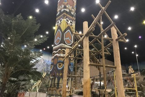 Одной из важных составляющих аттракциона является центральная входная группа, которая несет в себе функцию привлечения посетителей и поэтому должна быть максимально заметна, чтобы притягивать внимание к аттракциону. Вход в «Лагуну» выполнен, как реплика древнего строения из тотемных столбов с этническими узорами и навесом из камышового тростника. Все конструкции были обработаны огнезащитным составом и полностью безопасны.