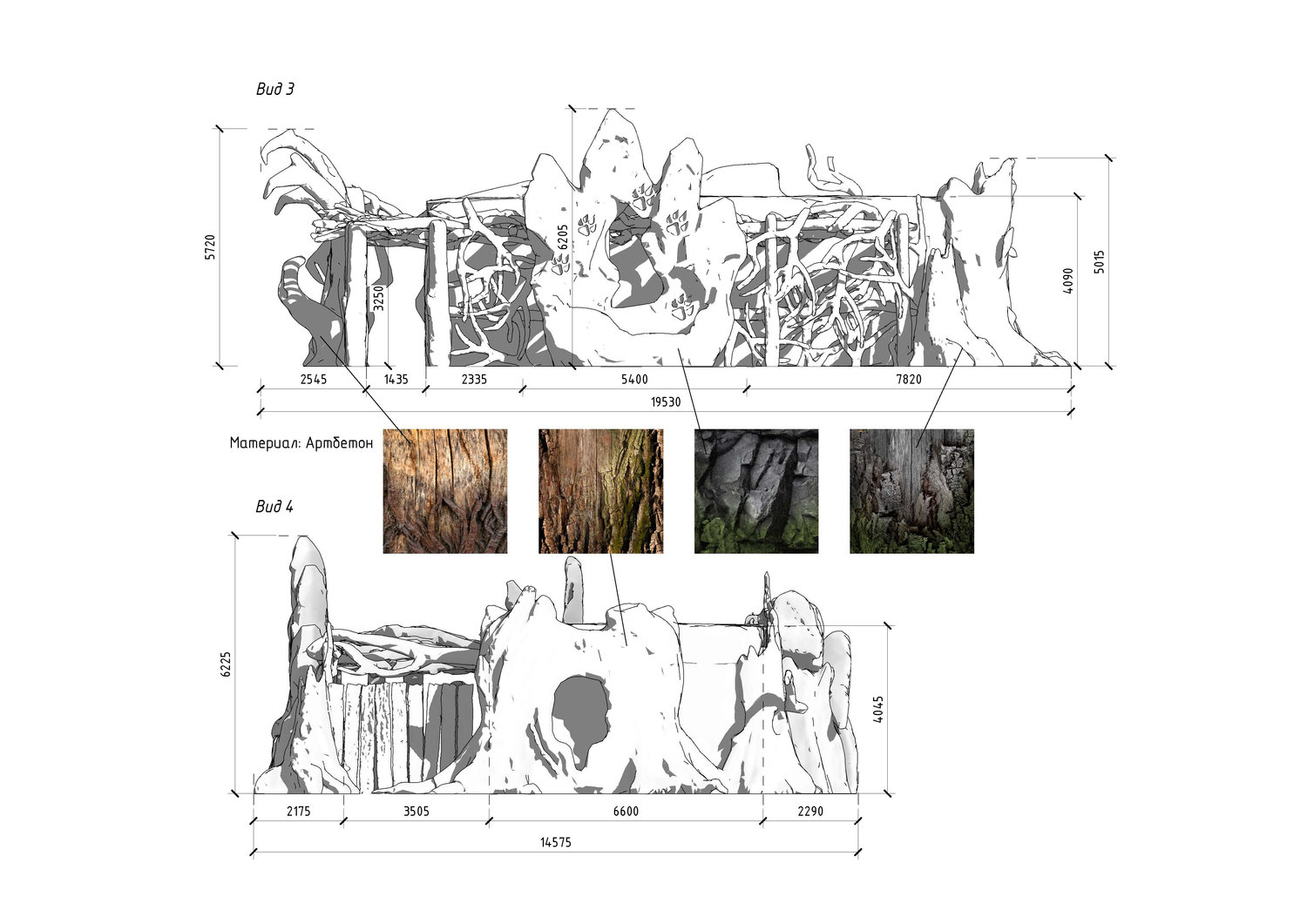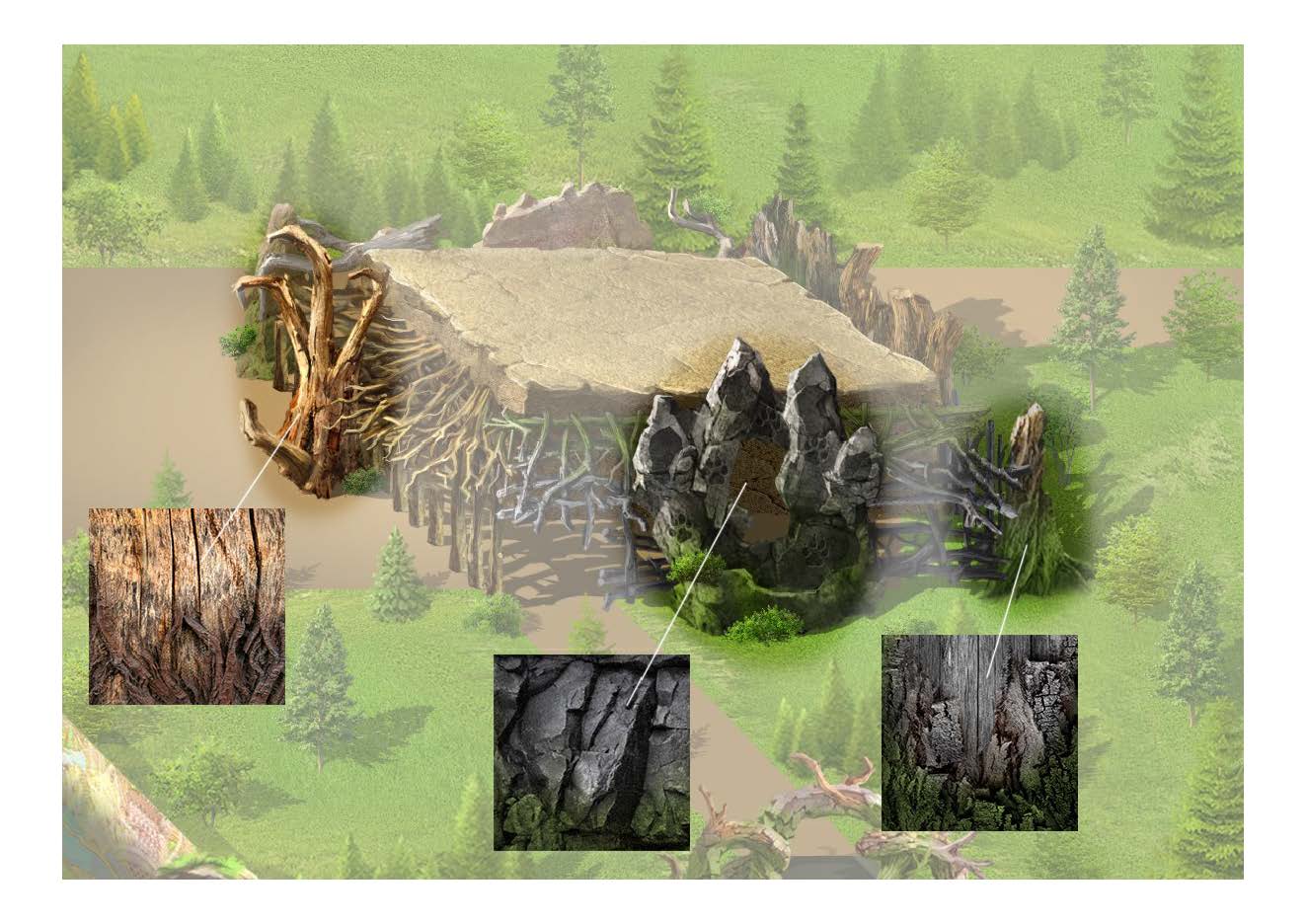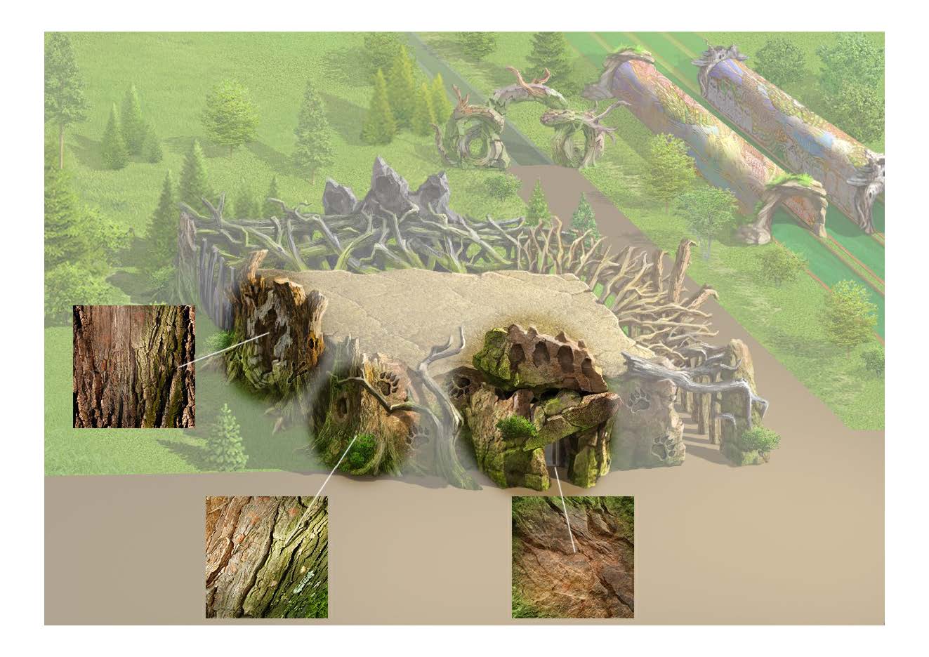 В основе визуальной и смысловой системы «Дримвуда» лежит образ алтайских духов-хранителей: Волка, Медведя, Совы и Орла. Эти архетипические фигуры формируют не только художественный язык среды, но и её внутреннюю логику, связывая природный контекст региона с мифологическим пластом восприятия. Архитектура станции тюбинга интерпретирует эту систему в форме условного мегалитического храма, где каждый фасад становится самостоятельным образом, посвящённым одному из духов.