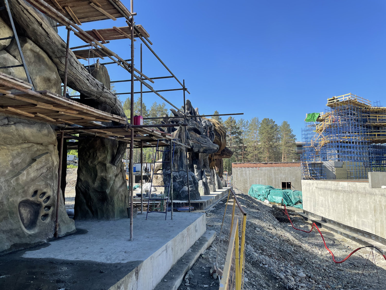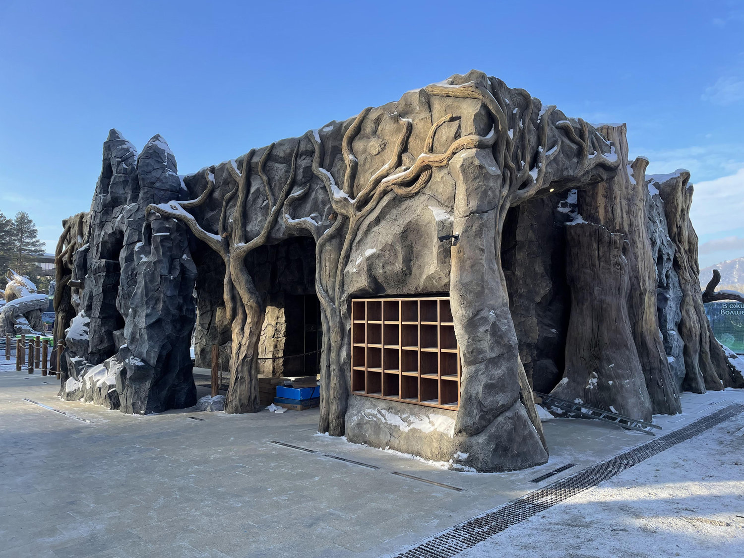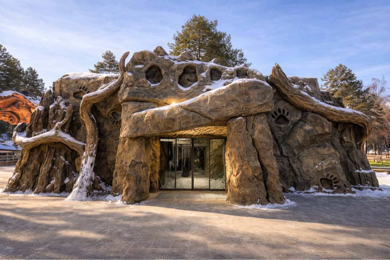 Фасад Медведя интерпретирован как образ берлоги: входная группа решена в виде массивной лапы, где углубления и выступы формируют подушечки, а нависающие каменные элементы читаются как когти. Тяжеловесность и монументальность форм подчёркивают силу, устойчивость и первобытную энергию образа.