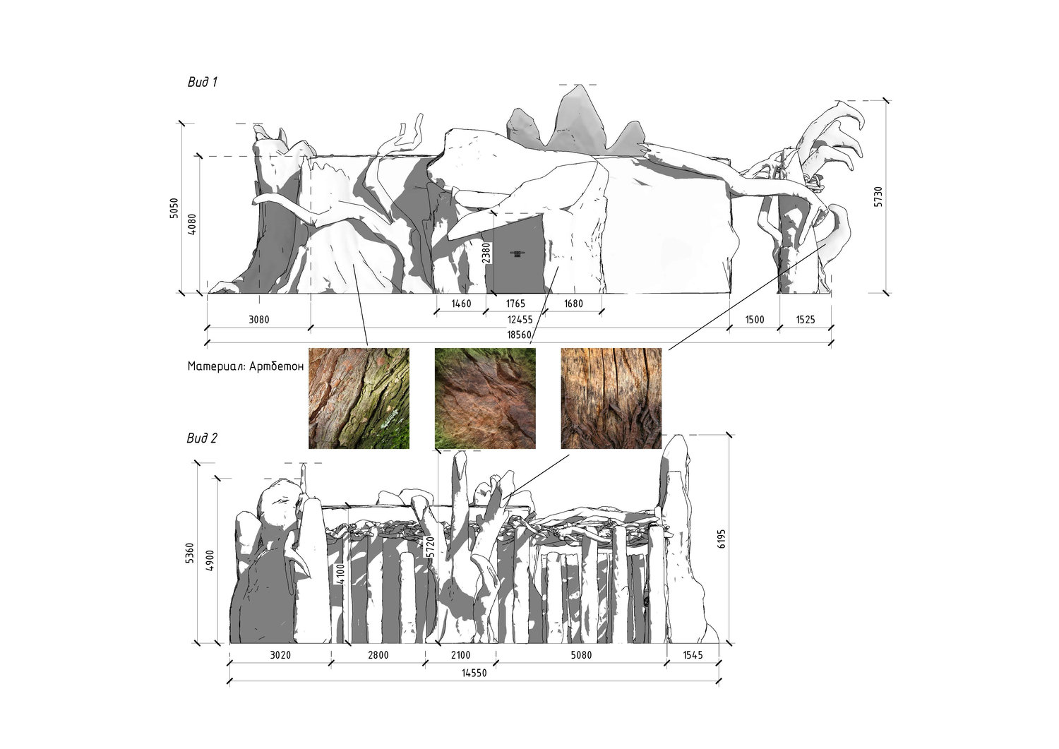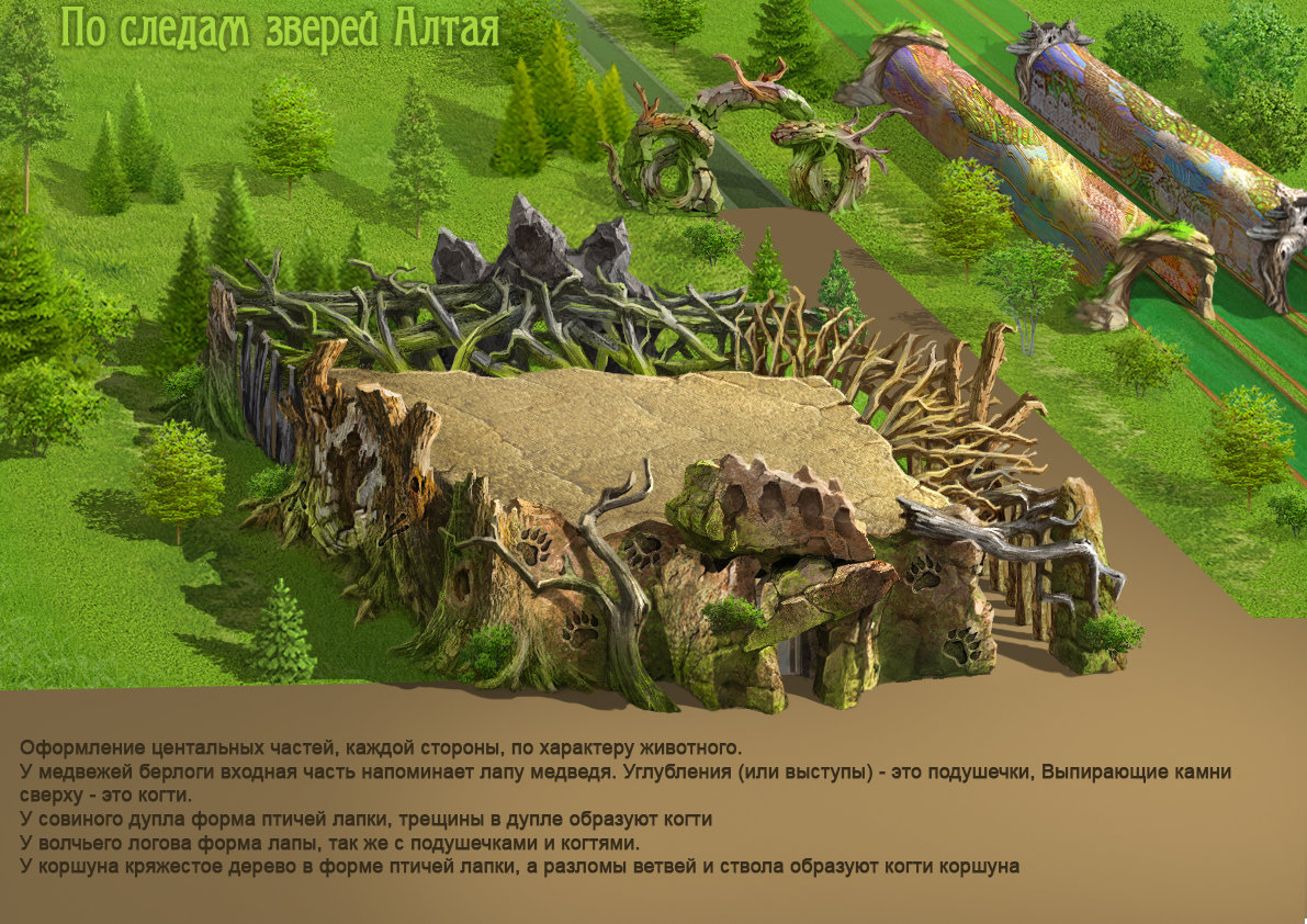 Художественное решение основано на принципе гиперболизации и трансформации характерных черт животных в архитектурную пластику. Масштабирование, обобщение и переработка природных форм позволяют сохранить их узнаваемость, адаптируя к требованиям конструктивной логики и эксплуатационной устойчивости. В результате здание выступает как связующее звено между реальным пространством и мифологическим нарративом, формируя у посетителя первичный эмоциональный отклик и задавая ожидание дальнейшего опыта. Центральные композиционные элементы фасадов раскрывают характер каждого духа-хранителя через пластические и фактурные решения.