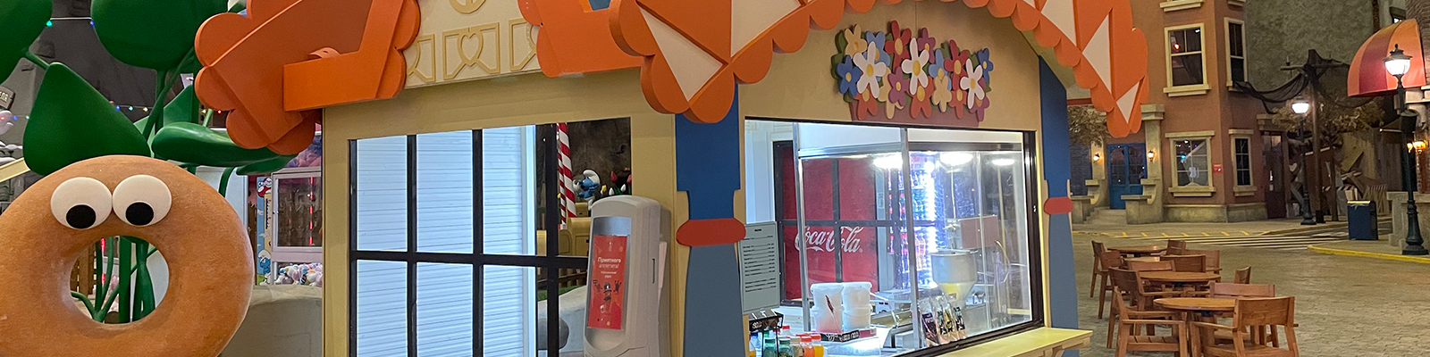 При размещении новых точек питания, самый применимый вариант — выполнить домик с продажей фастфуда в формате сказочной зоны, в которой он находится. Для этого каждый элемент должен быть отработан максимально детально и аутентично. Если выполняется антураж киоска с сахарной ватой, то гигантская вата должна смотреться так, чтобы ее захотелось съесть прямо с крыши. Если в домике продаются пончики, то главный элемент на домике должен выглядеть, как реальный гигантский пончик, выпеченный и покрытый глазурью, выполненный специально для книги рекордов Гиннесса.